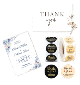 Cartes “thank you”, stickers et supports de packaging personnalisés pour valoriser votre marque et renforcer votre image professionnelle.