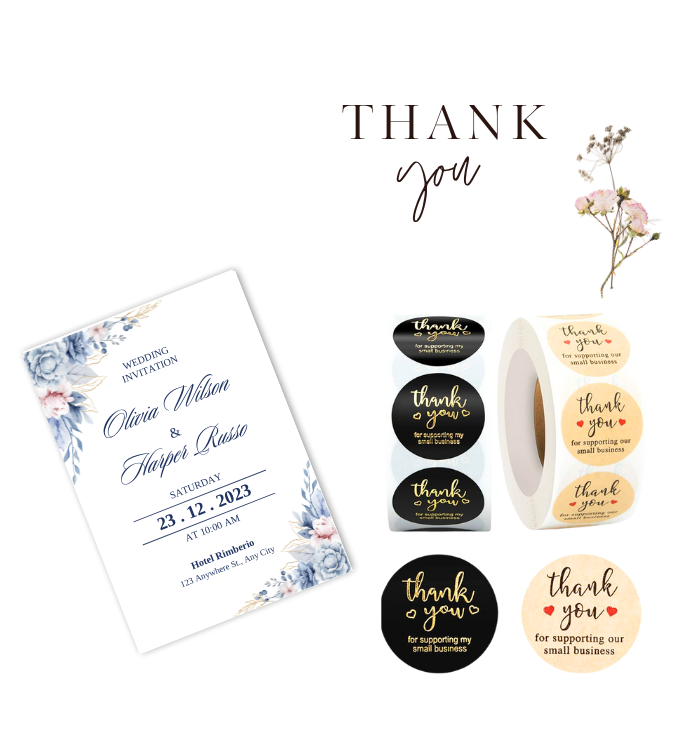 Cartes “thank you”, stickers et supports de packaging personnalisés pour valoriser votre marque et renforcer votre image professionnelle.