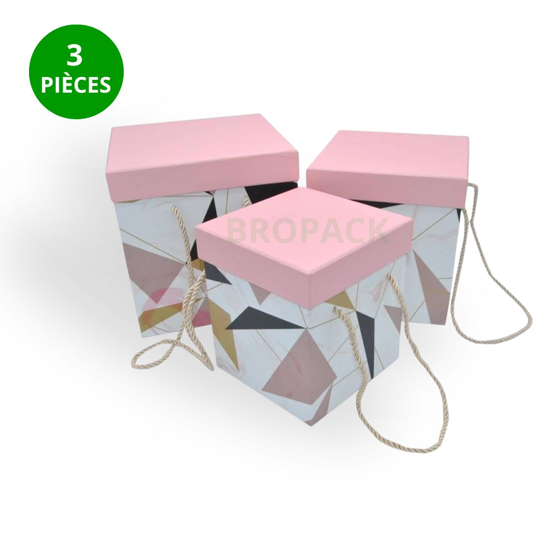 Ce set de 3 boîtes cadeaux carrées est à la pointe de la mode avec son design exclusif. Il combine l’élégance du motif géométrique qui rappelle le marbre et les touches or rose/pastel avec un couvercle uni rose doux, créant un contraste moderne et féminin.